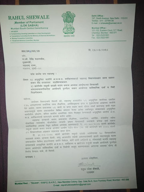 मातंग पंचायतन संघ या सामाजिक संघटनेने आपली सामाजिक जबाबदारी पार पाडत MRPS-MASS या संघटनेने चालवलेली मोहीम- मातंग समाजाची जिव्हाळ्याची मागणी आरक्षणात अ ब क ङ वर्गीकरण व लहुजी साळवे अभ्यास आयोगा च्या शिफारशींची अमलबजावणी संदर्भातील खासदार/आमदार यांचे मुख्यमत्र्यांना शिफारस पत्र पाठपुरावा करने ..या संदर्भातील खासदार मा. श्री. राहुलजी शेवाळे साहेब यांचे कडून शिफारसीचे पत्रक प्राप्त केले सदर पत्रक मातंग पंचायतन संघाचे महाराष्ट्र प्रदेश अध्यक्ष श्री. सुरेशजी काळोखे यांच्या हस्ते मातंग अस्मिता संघर्ष सेनेचे(मास) प्रदेशाध्यक्ष श्री. राजाभाई सूर्यवंशी यांचे कडे सुपूर्द करण्यात आले त्यावेळी उपस्तीत मातंग पंचायतन संघाचे पदाधिकारी व समाजबांधव तसेच शिफारस पत्र दिल्याबद्दल सर्व मातंग पंचायतन संघाचे पदाधिकारी व समाज बांधव यांच्याकडून खासदार श्री.मा. राहुलजी शेवाळे साहेब यांचे मनपुर्वक आभार.
